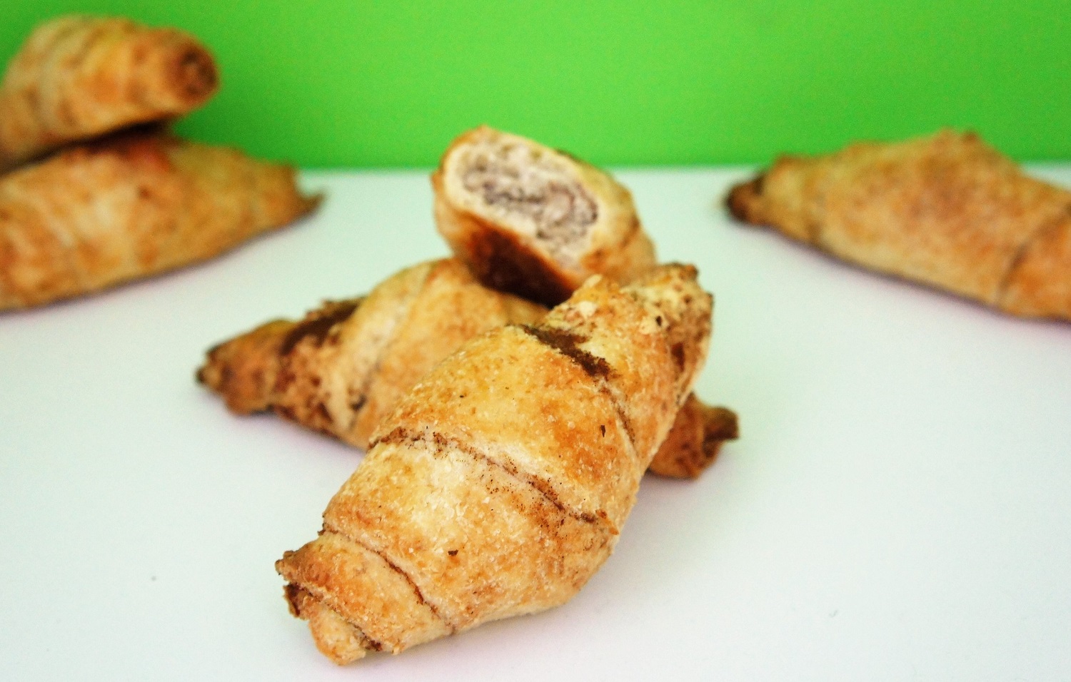 7. Těsto potřeme náplní a začneme zabalovat jednotlivé trojúhelníky od nejširší části po špičku.
